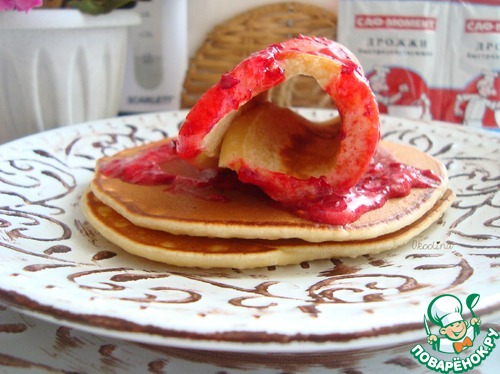Толстые, дрожжевые блины из пшеничной муки и муки из жмыха кунжута, с ванилью. Блины на завтрак с протёртой клюквой.