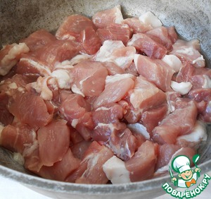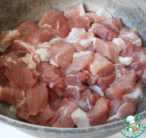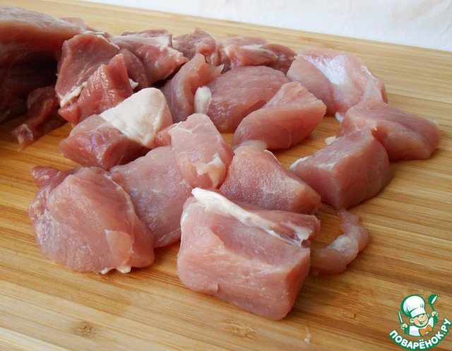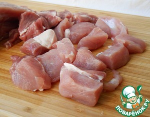 Свинину помыть, обсушить, нарезать средними кусочками.