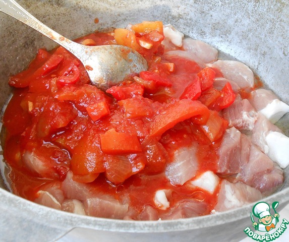 Для приготовления лучше использовать толстостенную посуду, глубокую сковороду или мультиварку. Я готовила в казане. Наливаем растительное масло, ровным слоем выкладываем мясо. Я не солила.