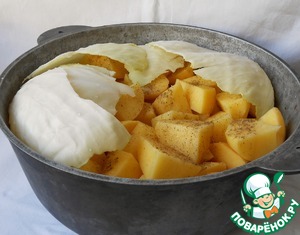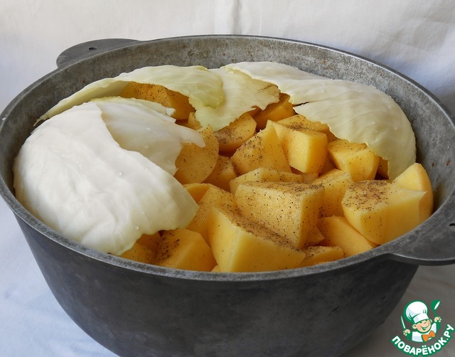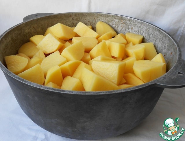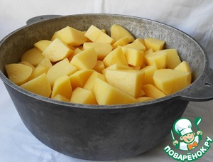 Чистим картошку, режем достаточно крупно, выкладываем в казан, солим, перчим по вкусу.