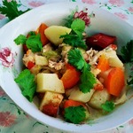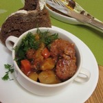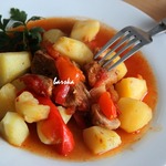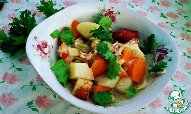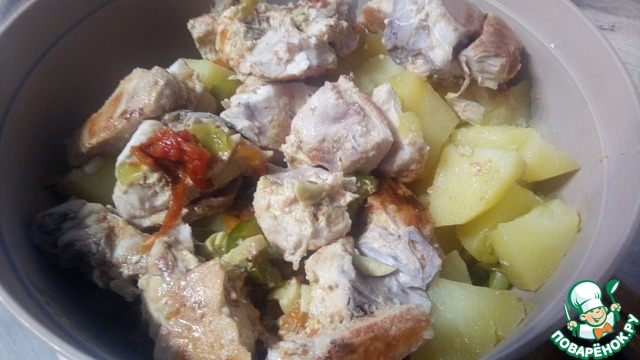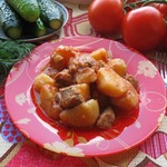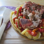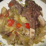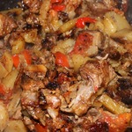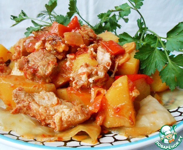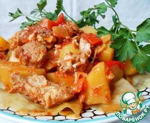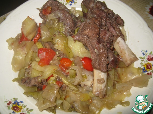 [+5]Готовила с говяжьими ребрышками, луком, болгарским перцем, помидорами, кабачками, картошкой и капустой. Все выкладывала слоями. Лечо, к сожалению, не дождалось своего часа и прокисло