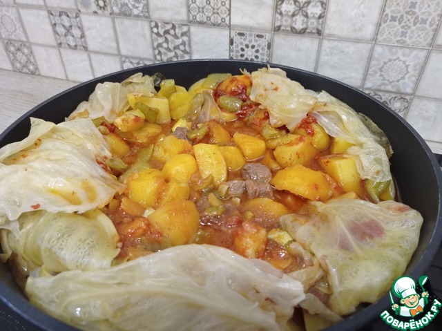 [+3]Только не поняла зачем сверху капустные листы? Вкуса блюду они не предали, сами после 2 часов томления не с’едобные.