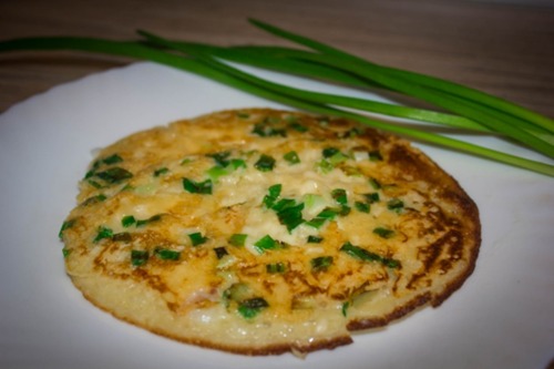 2. Затем на незастывшее тесто выложим тертый сыр и лук, подождем, пока тесто схватиться, и осторожно перевернем блинчик.
