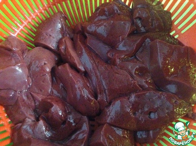 Печень нарезать тонкими пластами средней величины. Вымочить в воде пол часа. За тем воду слить.