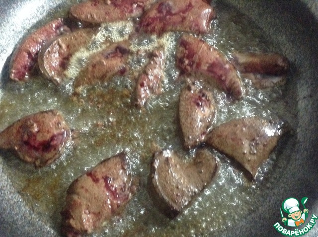 В разогретом растительном масле обжарить печень с двух сторон. Примерно по полторы минутки с каждой стороны. Печень вынуть из масла и остудить.
