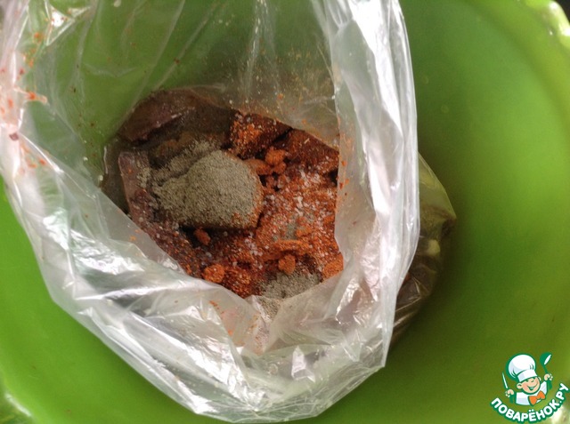 Пакет завязать и хорошо встряхнуть несколько раз. Чтобы равномерно распределись специи и соль. Оставить так на час.