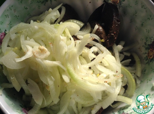 По истечении времени маринад слить и смешать печень с луком. Откорректировать на соль.