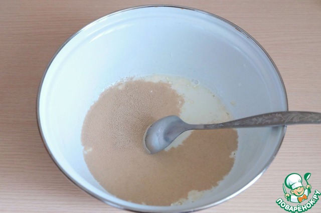 В миску добавить 1 ст. молока и 1/2 стакана воды, смесь подогреть, добавить сахар (2 ст. ложки без горки).