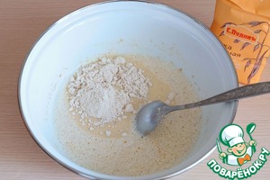 К смеси добавить остальную часть пшеничной муки. Смесь взбить.