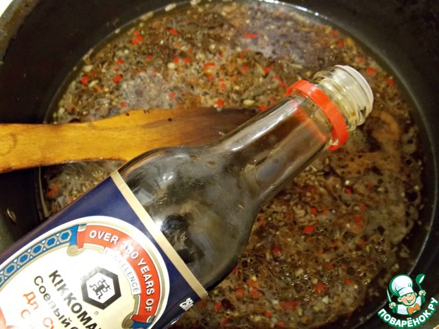 • Влить соевый соус от ТМ "Kikkoman", "Кока колу", довести до кипения.