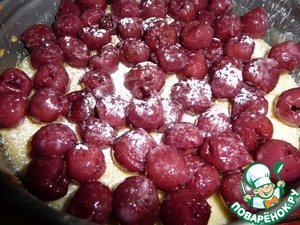 С вишни слить сок. Если у вас замороженная, следует разморозить. Кислую вишню слегка присыпать сахаром. Припылить крахмалом.