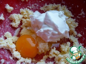Муку смешать с разрыхлителем теста, просеять. Добавить мучную смесь в яично-масляно-сахарную массу, перемешать и замесить тесто (тесто липнет к рукам).