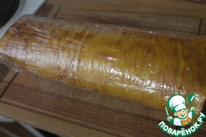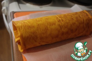 Готовый бисквит отделяем от пергамента и быстро сворачиваем в рулет. Оставляем на 10 минут.