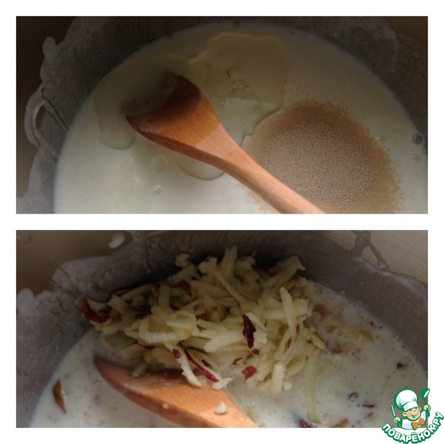 Влить масло и добавить дрожжи. Перемешать. Яблоко вместе с кожурой натереть на крупной терке. Добавить к тесту и перемешать.