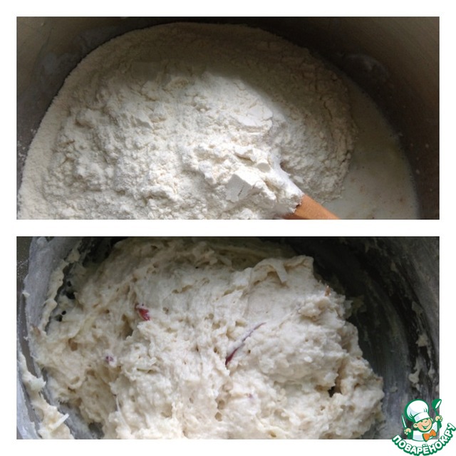 Добавить муку и вымесить тесто деревянной ложкой буквально пару минут. Тесто липкое получается, густое. Оставить тесто на час в теплом месте.