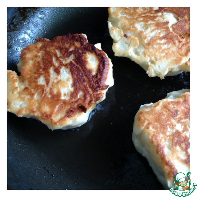 Подошедшее тесто обмять. Жарить оладьи с двух сторон на разогретой сковороде с двух сторон при закрытой крышке на умеренном огне. Тесто выкладывать на сковороду ложкой, смоченной в холодной воде.
