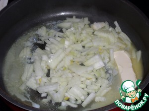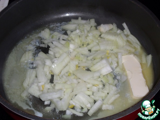 В сковороду выкладываем сливочное масло и нарезанный лук.