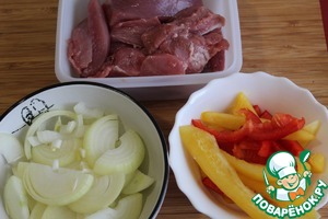 Порезать мясо средними кусками, порезать крупно лук, болгарский перец порезать крпуными полосками.