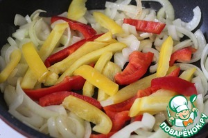 В сковороду, где обжариваласьиндюшка, добавить сливочноемасло и обжарить лук с чесноком пару минут, потом добавить перец и еще обжаривать пару минут.