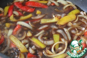 В соус к овощам выложить мясо и, постоянно мешая, выпаривать соус, пока соус полностью не испарится - у меня ушло 13 минут.
