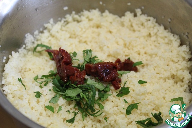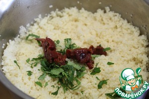 Кус-кус посолить, залить кипятком, влить 2ст л оливкового масла и закрыть крышкой на 15 минут. После добавить по вкусу вяленые томаты и зелень, аккуратно перемешать вилкой и накрыть крышкой. Гарнир готов.