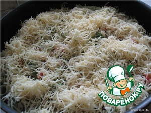 Берем ракушку, кладем в нее соразмерный кусочек начинки и укладываем в посуду, предназначенную для духовки.