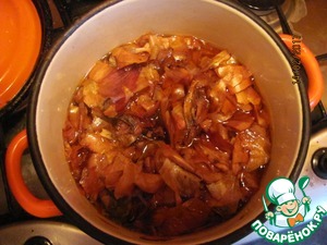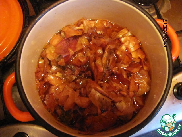 Готовим рассол. В воде растворить соль, сахар, чай и добавить тщательно вымытую луковую шелуху. Довести до кипения и дать остыть.