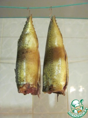 Ежедневно утром и вечером переворачивать рыбку. По истечении 3 дней вытащить скумбрию, промыть под проточной водой. И подвесить с помощью проволоки или канцелярских скрепок на 1 день.