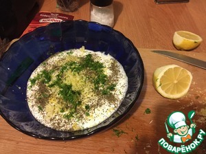 Всё это соединить с йогуртом, выдавить сок половины лимона и тщательно перемешать.