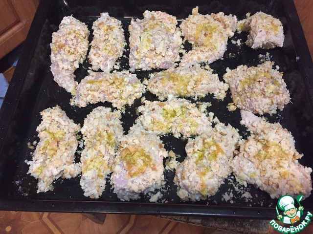 Смазать противень маслом, обвалять курицу в панировочных сухарях и выложить на противень, что бы куски не соприкасались друг с другом и каждый кусок полить немного маслом сверху.