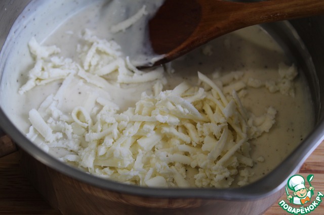 Добавить соль и перец по вкусу, всыпать сыр и перемешать.