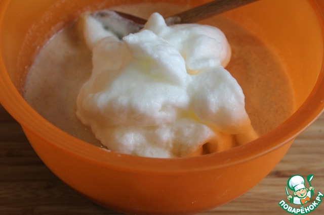 Белки взбить и аккуратно ввести в тесто, убрать на 30 минут в теплое место.