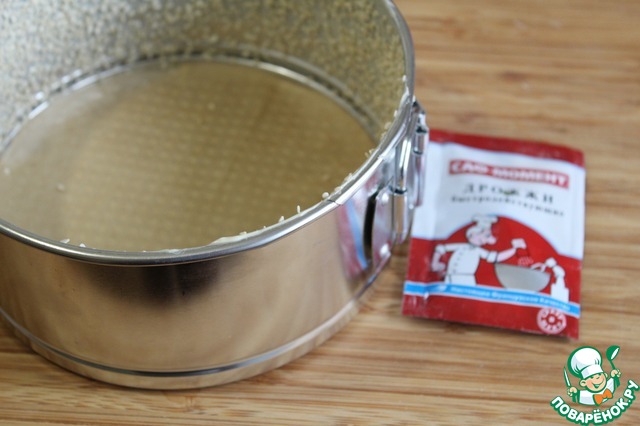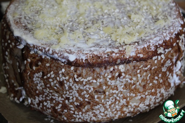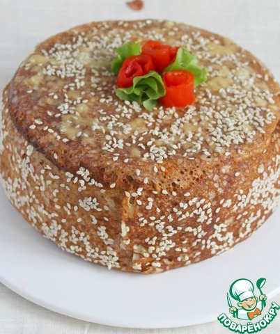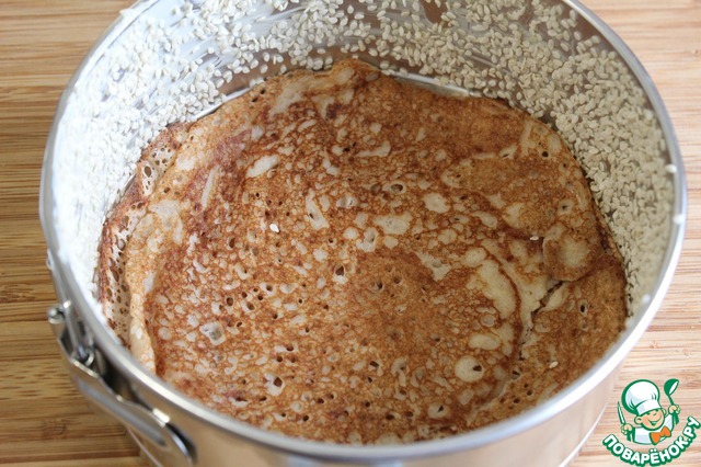 Форма разъемная на 18 см. Бока смазать маслом и присыпать кунжутом, дно выложить пергаментом.