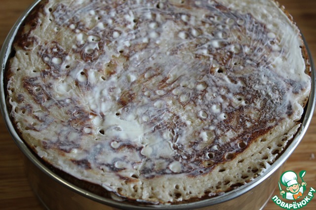 Завершающий блин смазываем сметаной и ставим в разогретую до 180 градусов духовку на 30 минут.