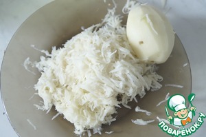 Налить в чашу теплое молоко и добавить соль, сахар и тертый картофель, перемешать.