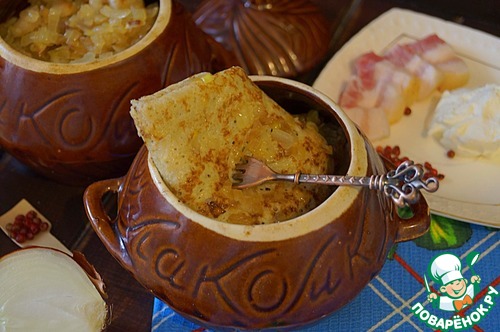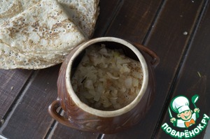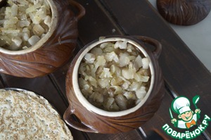 Каждый блин свернуть треугольником и начать выкладывать в горшочки по одному. На каждый блин выкладываем немного обжаренного лука. Выкладываем блины, пока не заполнится весь горшочек.