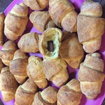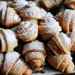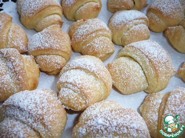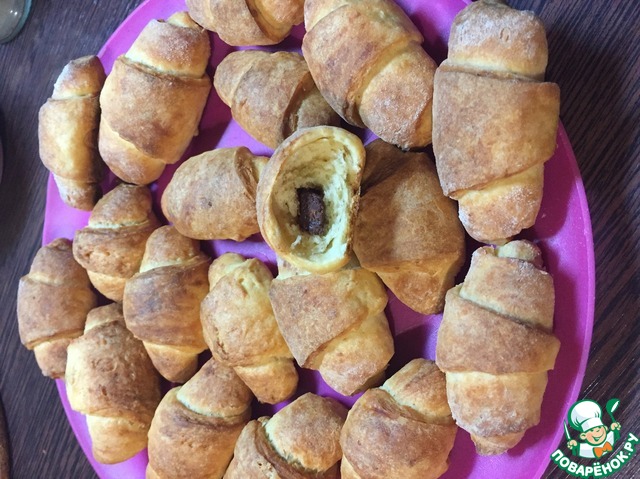 Выложить рогалики на противень покрытый пекарской бумагой. Кладите рогалики на хвостик, чтобы сохранилась форма и на некотором расстоянии друг от друга. |