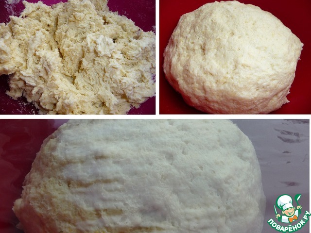 Когда тесто достаточно охладилось, вынуть из холодильника, слегка обмять на руках и разделить на 2 части. Рабочую поверность посыпать мукой. |