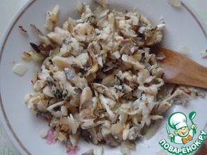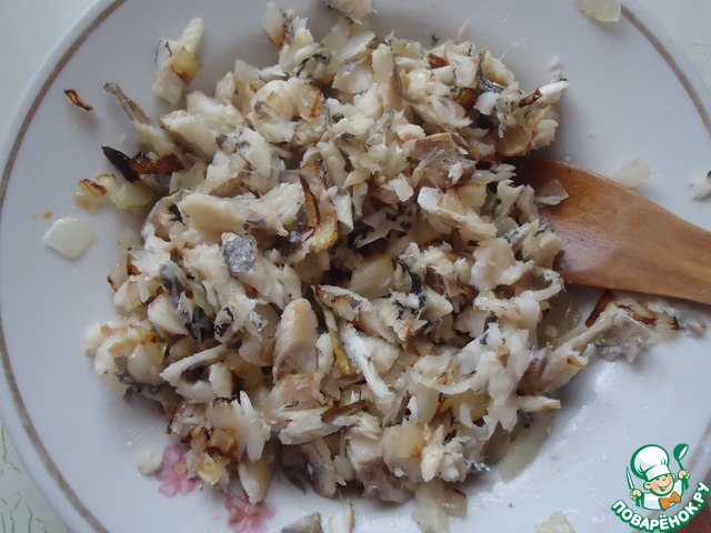 Припек готовится следующим образом: отварную рыбу тщательно отделить от костей, порезать произвольно, лук репчатый нарезать и пережарить на растительном масле. Рыбу перемешать с луком, посолить по вкусу.