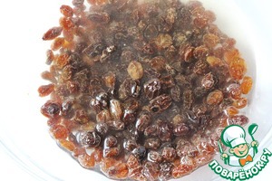 Изюм заранее промываем и заливаем стаканом кипятка, оставляем на некоторое время и даем ему распариться. Позже воду сливаем, а изюм промокаем бумажным полотенцем.