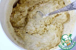 Добавляем 2 яйца и тщательно вымешиваем. Тесто по консистенции должно получится, как очень густая сметана, если у вас получилось пожиже, то можно добавить еще пару ложек пшеничной муки. В тесто добавляем заранее подготовленный изюм. Миску с тестом накрываем полотенцем и даем выстояться 1 час. Через час наше тесто увеличится приблизительно в три раза.