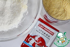 Смешиваем пшеничную и кукурузную муку тонкого помола, добавляем 1 чайную ложку быстродействующих дрожжей ТМ "САФ-МОМЕНТ" и просеиваем в миску. Добавляем сахар, соль и ванильный сахар. Мы любим, чтобы тесто у оладий было сладковатым, что в сочетании с изюмом даст приятный десертный вкус.
