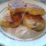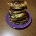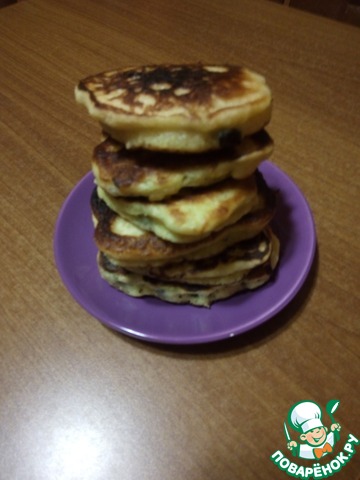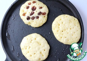 Раскаляем сковороду, особо не перемешивая, зачерпываем столовой ложкой тесто вместе с изюмом и выкладываем на сковороду, выпекаем оладушки на небольшом огне.