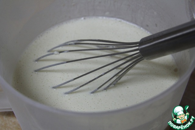 • Добавить яйцо и еще раз перемешать. Добавить оставшееся молоко и вновь перемешать. Тесто достаточно жидкое, не удивляйтесь.