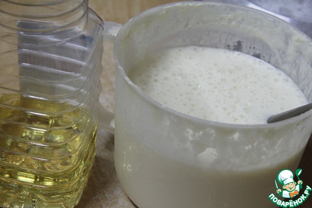 • По истечении времени вы увидите пышную пенку на поверхности теста, но тесто не станет очень густым. Добавить растительное масло, перемешать.