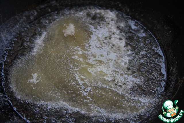 • В сковороде распустить сливочное масло, добавить сахар, перемешать, прогреть 2-3 минуты.