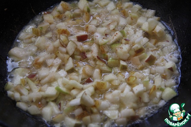 • Фрукты выложить в сахарно-масляную смесь, перемешать и припустить до мягкости (около 5 минут). Соус готов. Можно поливать блинчики или начинять этим соусом.