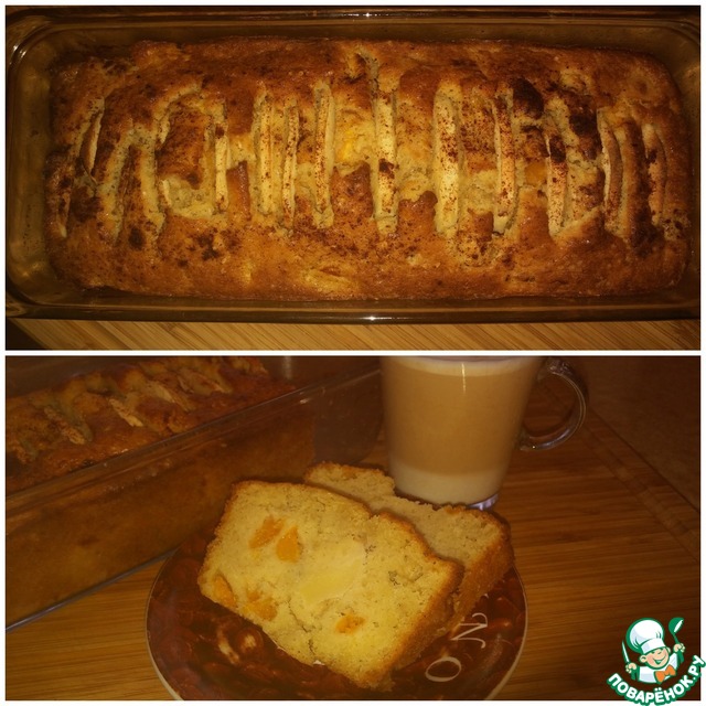Одно яблоко натерла на крупной тёрке и добавила мелко порезанные абрикосы (6 шт ) , еще я уменьшила сахар до 100 гр и добавила корицу в тесто ( уж очень я её люблю ).