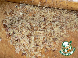 Орехи подавить скалкой. Не надо раздавливать до муки, пусть будут кусочки.