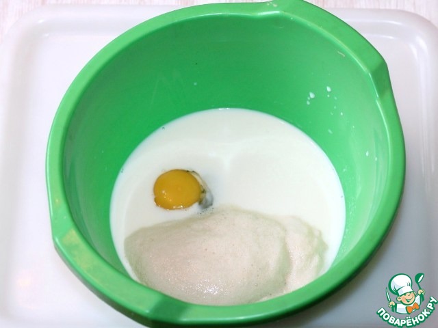 1. Приготовим опару. Растворяем дрожжи в 60 мл теплого молока и 1 ч. л. сахара. Оставляем в теплом месте до появления "шапки".
